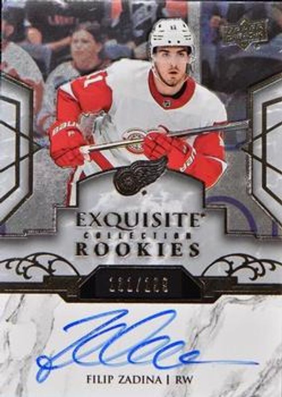 The Filip Zadina 2021 Upper Deck Ice #R8 2019 Upper Deck Exquisite Collection Update /65 card is 1 of 7 Filip Zadina's card variations in the 2021 Upper Deck Ice set being tracked by Sports Card Investor, including #09T-FZ 2019 Upper Deck Exquisite Collection Update /65, #SS-FZ 2019 Upper Deck Ice Update /49, #IBR-FZ 2019 Upper Deck Ice Update /49, #SZ-26 2019 Upper Deck Ice Update /49, and #SW-FZ 2019 Upper Deck Ice Update /49.
