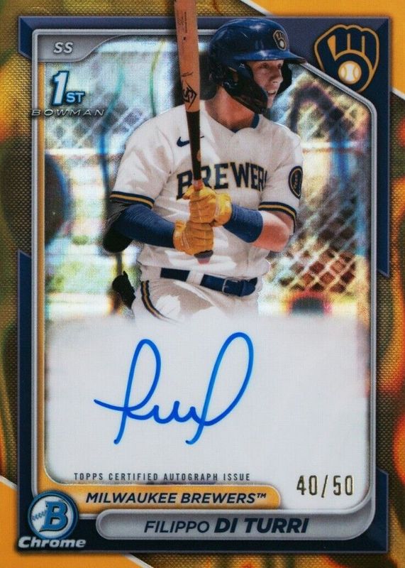Best Prices Available For Sale of Filippo Di Turi 2024 Bowman #CPA-FDI Chrome Prospect Auto - Gold Lava Refractor /50 (1st)