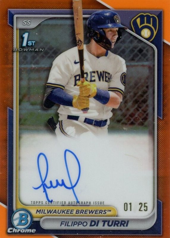 The Filippo Di Turi 2024 Bowman #CPA-FDI Chrome Prospect Auto - Orange Refractor /25 (1st) card in Raw condition has not changed in price in the last 30 days and was last sold for $75.00 .