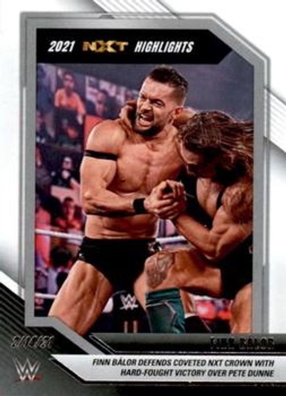 The Finn Balor 2022 Panini WWE NXT #6 2021 NXT Highlights card is 1 of 67 Finn Balor's card variations in the 2022 Panini WWE NXT set being tracked by Sports Card Investor, including Base, Green, Silver, Red /199, and Blue /149.