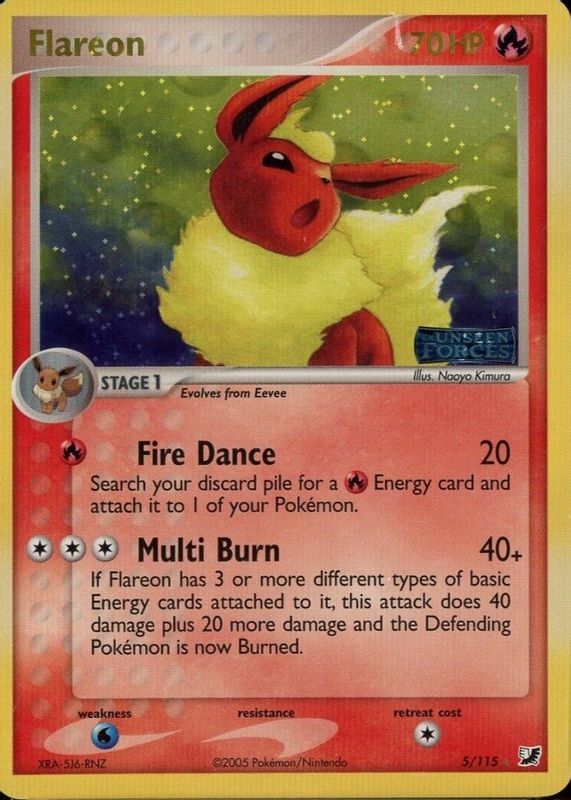The Flareon 2005 EX: Unseen Forces #005/115 Reverse Holo card in Raw TCG (Near Mint) condition has moved down -$40.05 (-14.6%) in the last 30 days and was last sold for $234.95 .