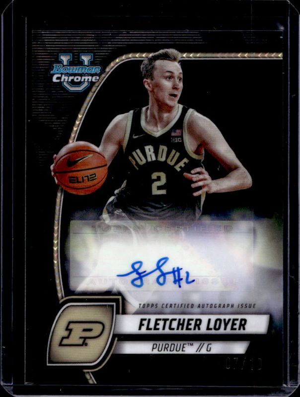 The Fletcher Loyer 2024 Bowman Chrome University Sapphire Edition #97 Prospect Autographs - Black Refractor /10 card is 1 of 18 Fletcher Loyer's card variations in the 2024 Bowman Chrome University Sapphire Edition set being tracked by Sports Card Investor, including Base, Purple Refractor /100, Yellow Refractor /75, Green Refractor /65, and Gold Refractor /50.
