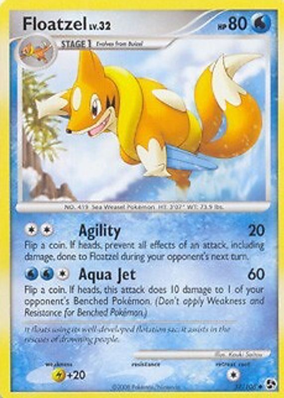 This card is 1 of 3 Floatzel's card variations in the 2008 Diamond & Pearl: Great Encounters set being tracked by Sports Card Investor, including Promo (Countdown Calendar), and Reverse Holo.