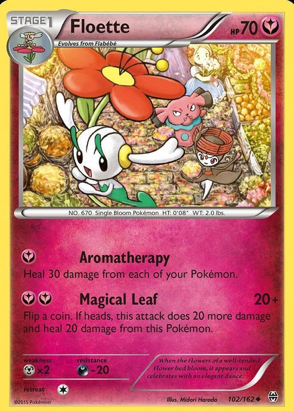 The Floette 2015 XY: BREAKthrough #102/162 Base card in Raw TCG (Lightly Played) condition has not changed in price in the last 30 days and was last sold for $1.25 .