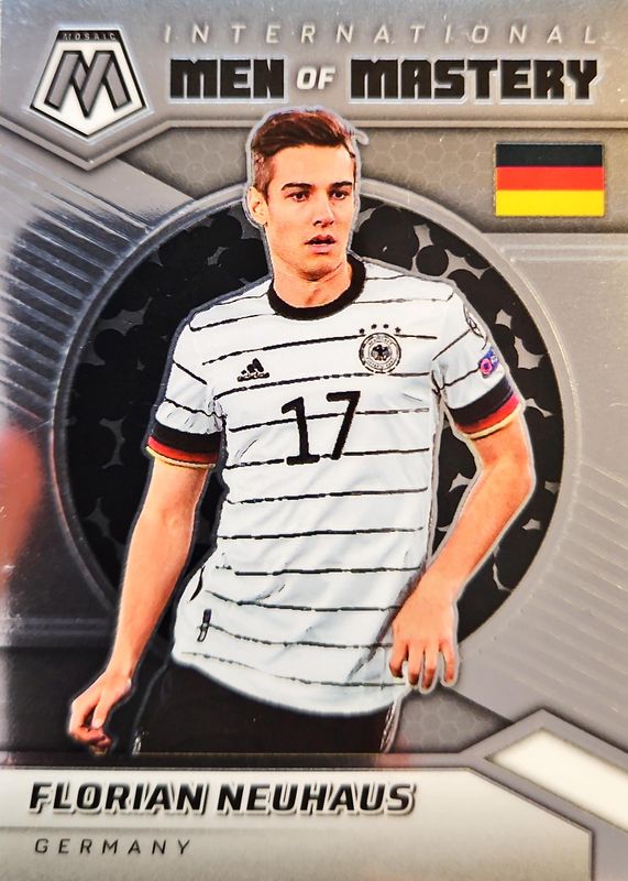 The Florian Neuhaus 2021 Mosaic Road to FIFA World Cup #2 International Men of Mastery card is 1 of 5 Florian Neuhaus' card variations in the 2021 Mosaic Road to FIFA World Cup set being tracked by Sports Card Investor, including Overdrive /(SSP), International Men of Mastery - White /25, International Men of Mastery - Gold /10, and International Men of Mastery - Black /1.