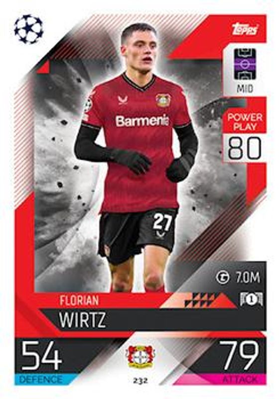 The Florian Wirtz 2022 Topps Match Attax UEFA Champions League & UEFA Europa League #232 Base card is 1 of 8 Florian Wirtz's card variations in the 2022 Topps Match Attax UEFA Champions League & UEFA Europa League set being tracked by Sports Card Investor, including #485 Base, #232 1st Edition, #232 Crystal, #232 Red Foil, and #485 Red Foil.