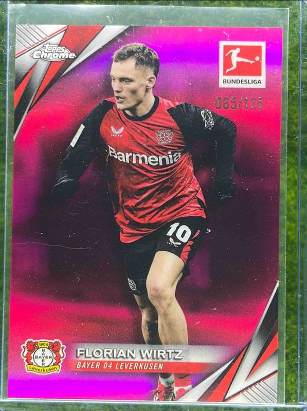 The Florian Wirtz 2024 Topps Chrome Bundesliga #66 Magenta Refractor /125 card is 1 of 52 Florian Wirtz's card variations in the 2024 Topps Chrome Bundesliga set being tracked by Sports Card Investor, including Base, Pulsar Refractor, Refractor, Neon Green Lava Refractor /250, and Neon Green Refractor /250.