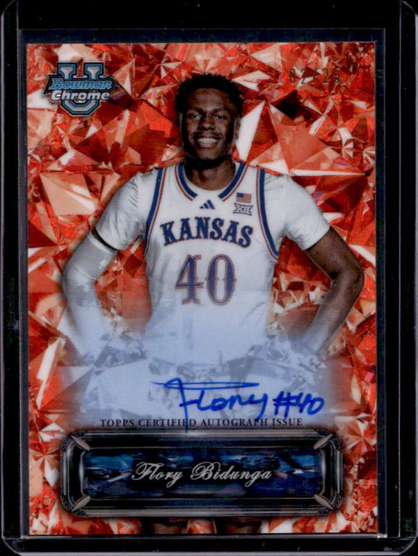 The Flory Bidunga 2024 Bowman Chrome University Sapphire Edition #SSA-FB Sapphire Selections Autographs - Orange Refractor /25 card is 1 of 27 Flory Bidunga's card variations in the 2024 Bowman Chrome University Sapphire Edition set being tracked by Sports Card Investor, including Base, Purple Refractor /100, Yellow Refractor /75, Green Refractor /65, and Gold Refractor /50.