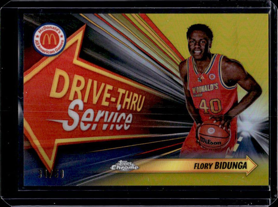 The Flory Bidunga 2024 Topps Chrome McDonald's All-American #DTS-FLB Drive-Thru Service - Gold Refractor /50 card is 1 of 112 Flory Bidunga's card variations in the 2024 Topps Chrome McDonald's All-American set being tracked by Sports Card Investor, including #85 Base, #35 Base, #35 Blue RayWave Refractor, #85 Blue RayWave Refractor, and #35 McDonald's Logo Refractor.