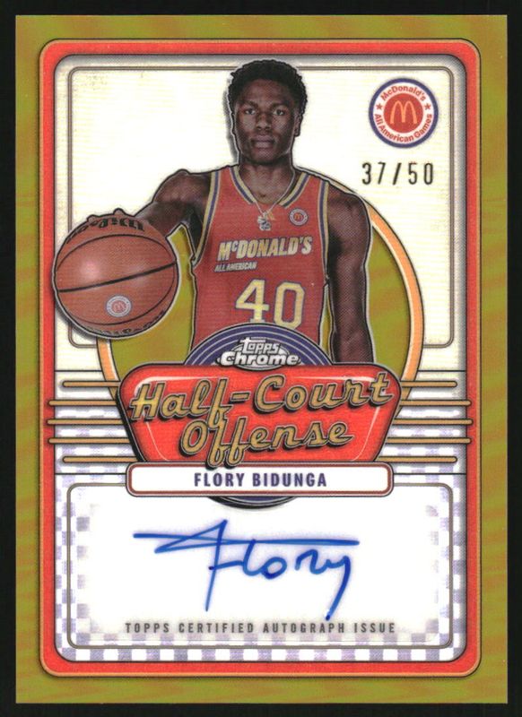 The Flory Bidunga 2024 Topps Chrome McDonald's All-American #IML-FLO Half-Court Signatures - Gold Refractor /50 card is 1 of 112 Flory Bidunga's card variations in the 2024 Topps Chrome McDonald's All-American set being tracked by Sports Card Investor, including #85 Base, #35 Base, #35 Blue RayWave Refractor, #85 Blue RayWave Refractor, and #35 McDonald's Logo Refractor.