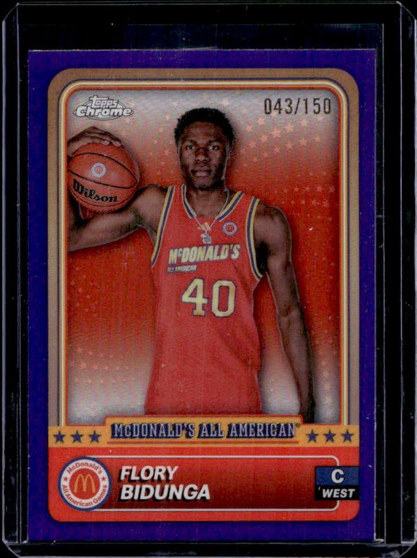 The Flory Bidunga 2024 Topps Chrome McDonald's All-American #85 Purple Refractor /150 card is 1 of 112 Flory Bidunga's card variations in the 2024 Topps Chrome McDonald's All-American set being tracked by Sports Card Investor, including #85 Base, #35 Base, #35 Blue RayWave Refractor, #85 Blue RayWave Refractor, and #35 McDonald's Logo Refractor.