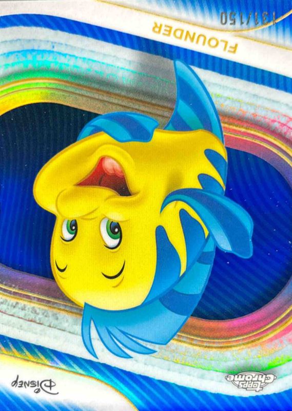 The Flounder 2025 Topps Chrome Disney #60 Blue Refractor /150 card is 1 of 31 Flounder's card variations in the 2025 Topps Chrome Disney set being tracked by Sports Card Investor, including Base, Mini Diamonds Refractor, Prism Refractor, Refractor, and Yellow Mini Diamonds Refractor.