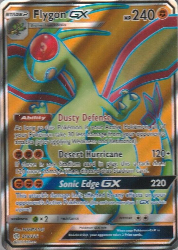 The Flygon GX 2019 Sun & Moon: Cosmic Eclipse #218/236 Holo (Full Art) card in Raw TCG (Near Mint) condition has moved down -$4.46 (-42.7%) in the last 30 days and was last sold for $5.99 .