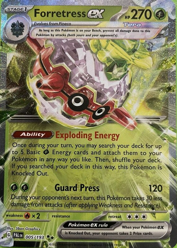 The Forretress ex 2023 Scarlet & Violet: Paldea Evolved #005/193 Double Rare card in Raw TCG (Near Mint) condition has moved down -$0.71 (-35.5%) in the last 30 days and was last sold for $1.29 .