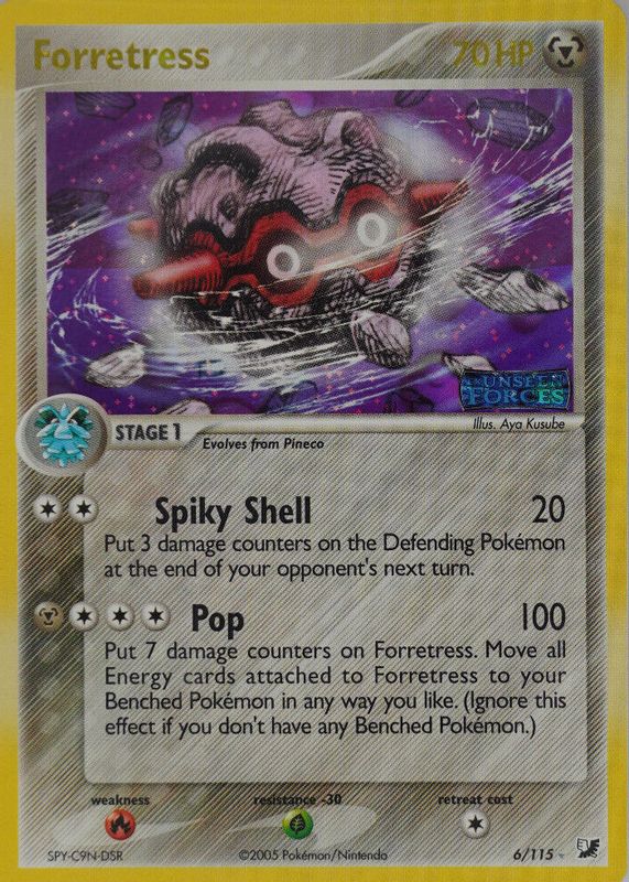 The Forretress 2005 EX: Unseen Forces #006/115 Holo card in Raw TCG (Near Mint) condition has moved up $2.65 (+15.6%) in the last 30 days and was last sold for $19.65 .