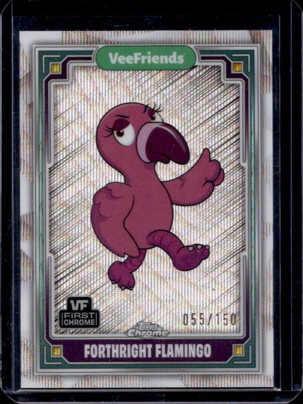 The Forthright Flamingo 2025 Topps Chrome VeeFriends #25 Wave Refractor /150 card is 1 of 22 Forthright Flamingo's card variations in the 2025 Topps Chrome VeeFriends set being tracked by Sports Card Investor, including Base, Refractor, Yellow Refractor, Shimmer Refractor /250, and RayWave Refractor /199.