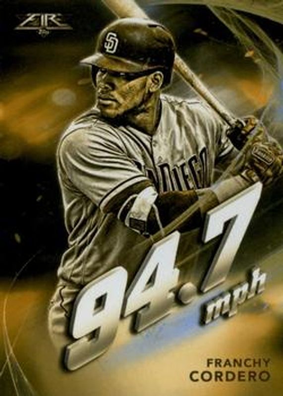 The Franchy Cordero 2019 Topps Fire #MV-7 Maximum Velocity - Gold Minted card is 1 of 3 Franchy Cordero's card variations in the 2019 Topps Fire set being tracked by Sports Card Investor, including Maximum Velocity, and Maximum Velocity - Blue Chip.