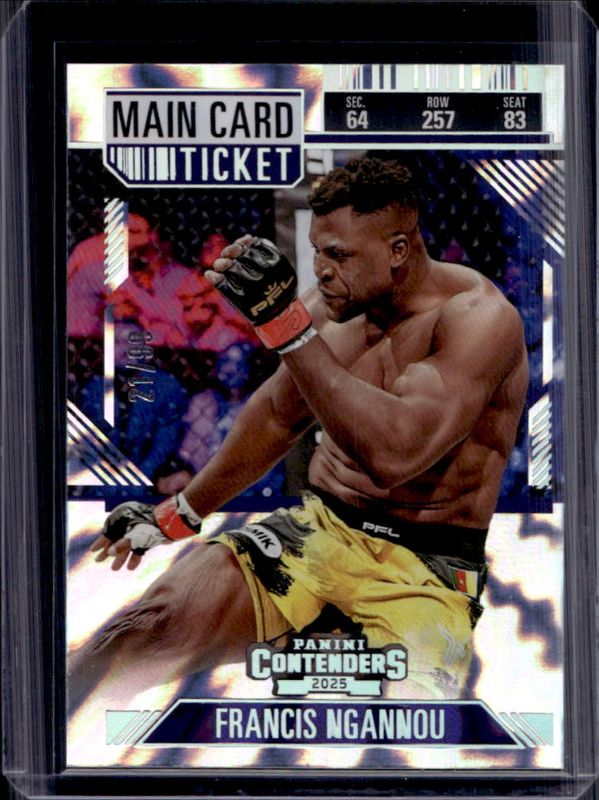 The Francis Ngannou 2025 Panini Contenders Professional Fighters League PFL #7 Main Card Ticket /99 card is 1 of 37 Francis Ngannou's card variations in the 2025 Panini Contenders Professional Fighters League PFL set being tracked by Sports Card Investor, including Retail, Season Ticket Silver, Season Ticket Red /299, Playoff Ticket /199, and Season Ticket Blue /199.