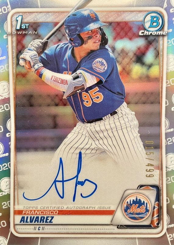 This card is 1 of 18 Francisco Alvarez's card variations in the 2020 Bowman Chrome set being tracked by Sports Card Investor, including Prospect Auto (1st), Prospect Auto - Purple Refractor /250 (1st), Prospect Auto - Blue Refractor /150 (1st), Prospect Auto - Choice Refractor /150 (1st), and Prospect Auto - Green Atomic Refractor /99 (1st).