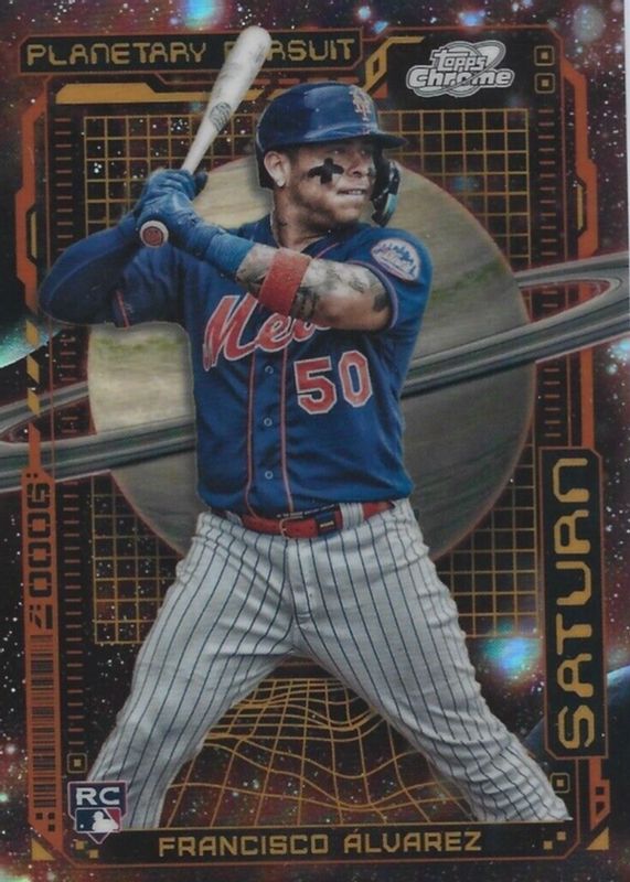The Francisco Alvarez 2023 Topps Chrome Cosmic #PPSA-5 Planetary Pursuit - Saturn Rookie card in Raw condition has not changed in price in the last 30 days and was last sold for $172.55 .