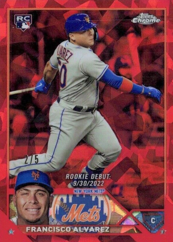 This card is 1 of 7 Francisco Alvarez's card variations in the 2023 Topps Chrome Update Sapphire Edition set being tracked by Sports Card Investor, including Rookie Debut, Rookie Debut - Gold /50, Rookie Debut - Orange /25, Rookie Debut - Black /10, and Rookie Debut - Padparadscha /1.