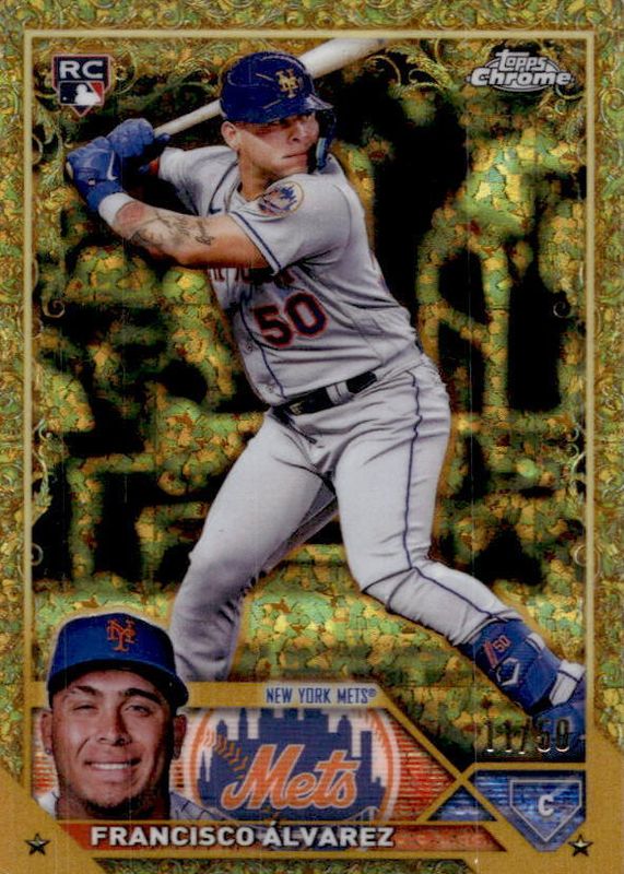 This card is 1 of 11 Francisco Alvarez's card variations in the 2023 Topps Gilded Collection set being tracked by Sports Card Investor, including Base /99, Wave Gold Etch Refractor /75, RayWave Gold Etch Refractor /25, Lava Gold Etch Refractor /10, and Superfractor /1.