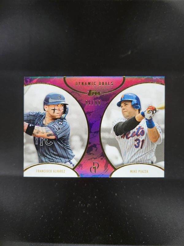 The Francisco Alvarez / Mike PIazza 2025 Topps Dynamic Duals #40 Purple /99 card is 1 of 7 Francisco Alvarez / Mike PIazza's card variations in the 2025 Topps Dynamic Duals set being tracked by Sports Card Investor, including Base, Black /50, Blue /25, Red /10, and Orange /5.