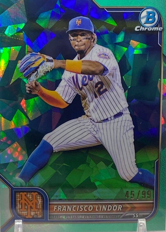 This card is 1 of 6 Francisco Lindor's card variations in the 2022 Bowman Chrome Sapphire Edition set being tracked by Sports Card Investor, including Orange /75, Yellow /50, Purple /25, Red /5, and Padparadscha /1.