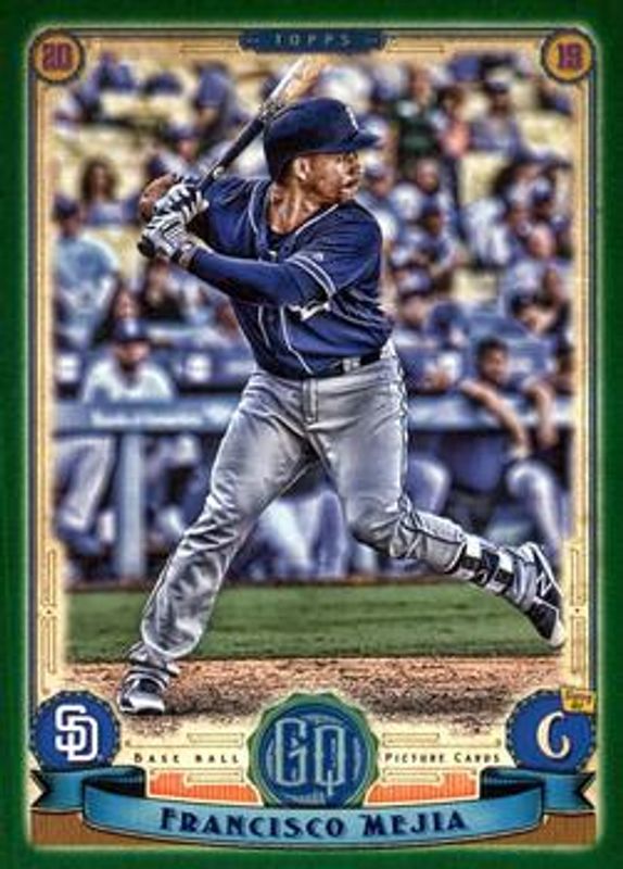 The Francisco Mejia 2019 Topps Gypsy Queen #243 Green card is 1 of 12 Francisco Mejia's card variations in the 2019 Topps Gypsy Queen set being tracked by Sports Card Investor, including Base, Bazooka Back, GQ Logo Swap, Missing Nameplate, and Purple.