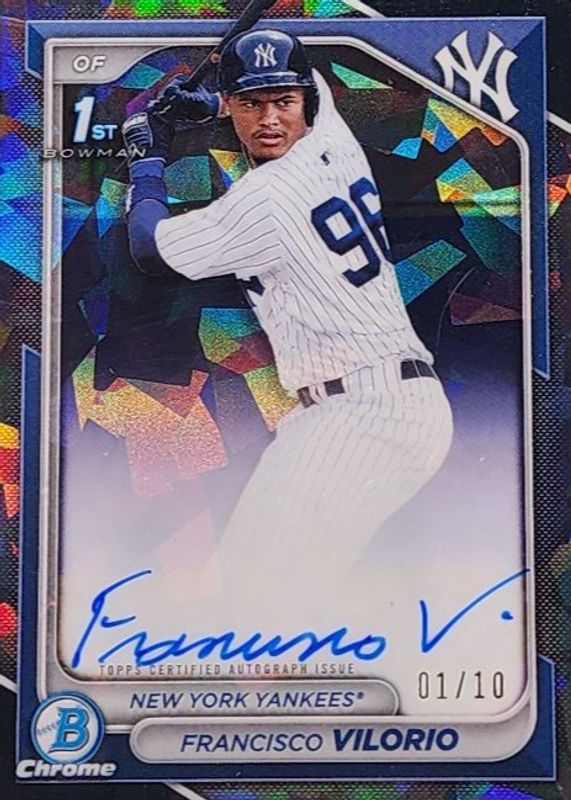 This card is 1 of 17 Francisco Vilorio's card variations in the 2024 Bowman Chrome Sapphire Edition set being tracked by Sports Card Investor, including Prospects Image Variation, Prospects Image Variation - Gold /50, Prospects Image Variation - Orange /25, Prospects Image Variation - Red /5, and Prospects Image Variation - Superfractor /1.