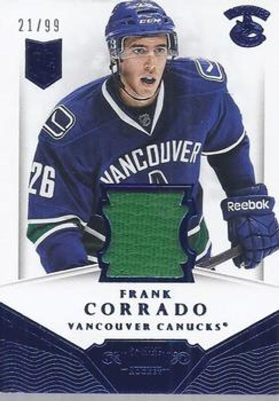 The Frank Corrado 2013 Panini Rookie Anthology #D-FC 2013 Panini Dominion Update: Authentic Material /99 card is 1 of 32 Frank Corrado's card variations in the 2013 Panini Rookie Anthology set being tracked by Sports Card Investor, including Purple /1, 2013 Score Update, 2013 Score Update: - Black, 2013 Score Update: - Gold, and 2013 Score Update: Hot Rookies Signatures.