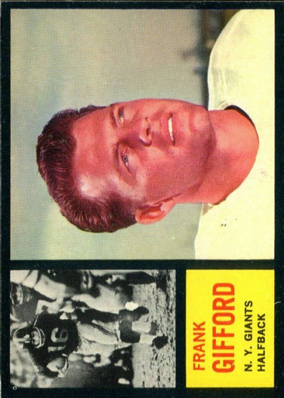 Frank Gifford's Football cards are available in at least 10 sets. Frank Gifford's biggest 7-day price movers are 1962 Topps #104 Base, 1952 Bowman Small #16 Base, and 1952 Bowman Large #16 Base.