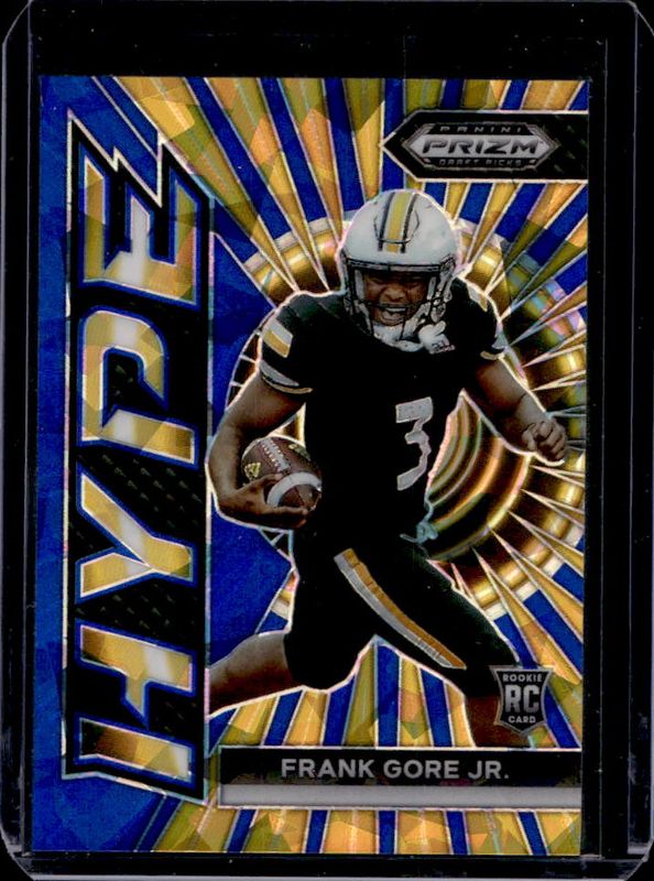The Frank Gore 2024 Prizm Draft Picks #HP-FGJ Hype - Blue Ice /99 card is 1 of 206 Frank Gore's card variations in the 2024 Prizm Draft Picks set being tracked by Sports Card Investor, including #159 Base, #79 Base, #159 Green, #79 Green, and #79 Purple Wave.