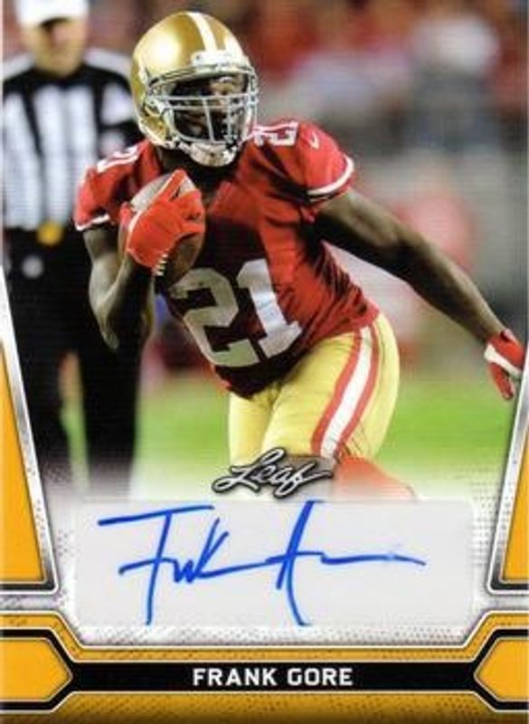 The Frank Gore 2021 Leaf #BA-FG1 Autographs card is 1 of 2 Frank Gore's card variations in the 2021 Leaf set being tracked by Sports Card Investor, including Autographs - Gold.