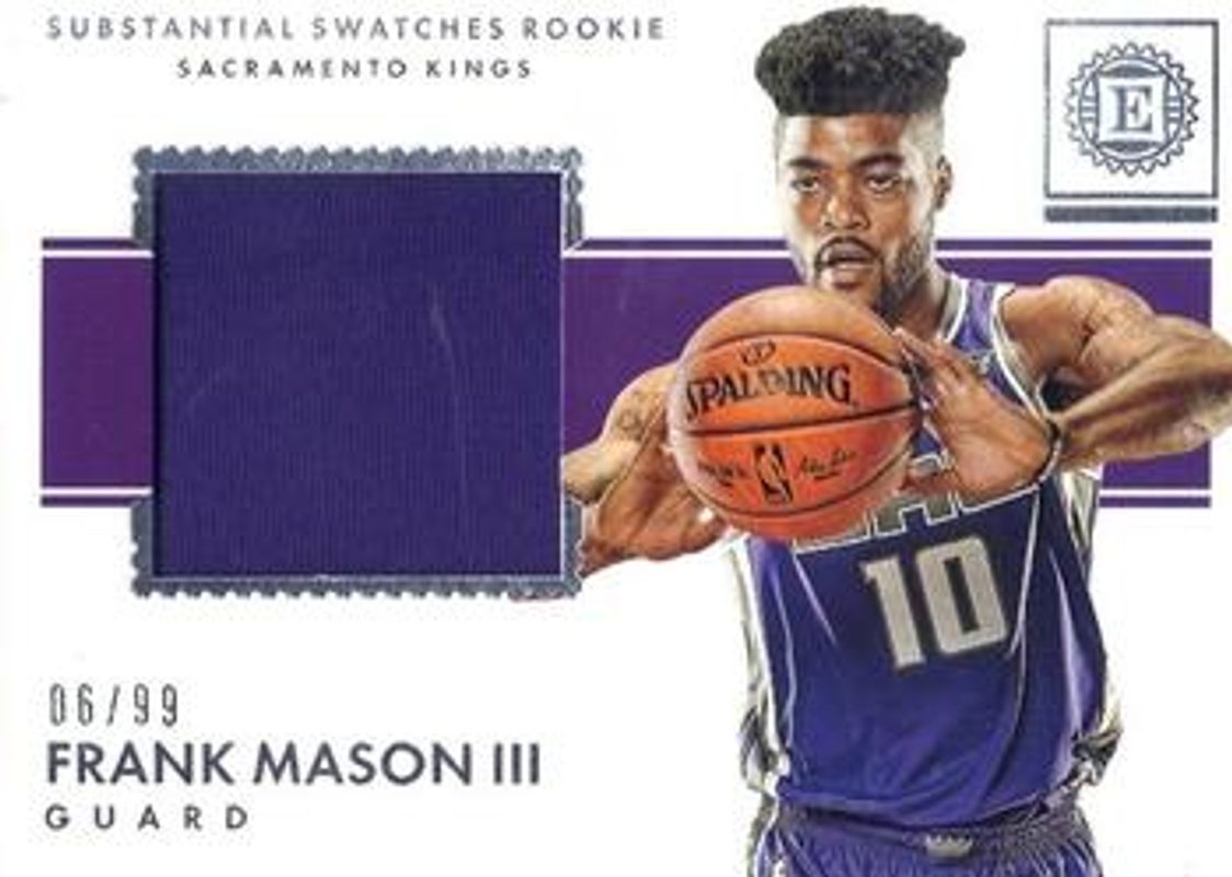 The Frank Mason III 2017 Encased #SR-FM3 Substantial Swatches Rookies /99 card is 1 of 21 Frank Mason III's card variations in the 2017 Encased set being tracked by Sports Card Investor, including #129 Base /99, #153 Base /99, #186 Base /99, #129 Red /25, and #153 Red /25.