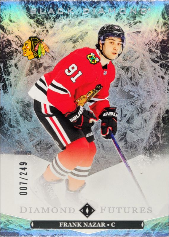 The Frank Nazar 2024 Upper Deck Black Diamond #BDF-FN Diamond Futures /249 Rookie card is 1 of 64 Frank Nazar's card variations in the 2024 Upper Deck Black Diamond set being tracked by Sports Card Investor, including Base /349, Diamond Relic Rookies /99, Premium Relics /50, Autographs /49, and Diamond Relic Rookies Emerald /10.