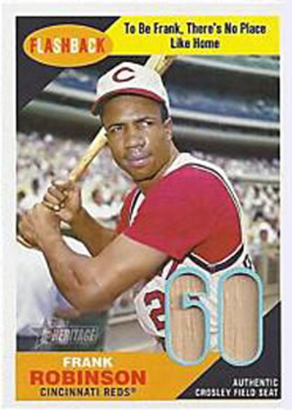 The Frank Robinson 2009 Topps Heritage #FR Flashback Stadium Relics card is 1 of 5 Frank Robinson's card variations in the 2009 Topps Heritage set being tracked by Sports Card Investor, including 50th Anniversary Buybacks, Clubhouse Collection Relics, Flashbacks, and 1960 Cut Signatures /1.