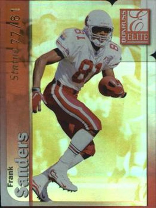 The Frank Sanders 1999 Donruss Elite #141 Status /28 card is 1 of 3 Frank Sanders' card variations in the 1999 Donruss Elite set being tracked by Sports Card Investor, including Base, and Aspirations /72.