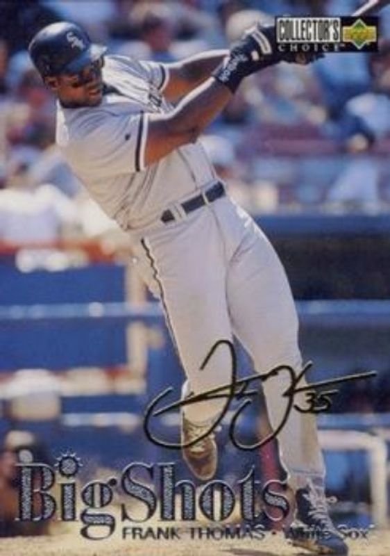 The Frank Thomas 1997 Upper Deck Collector's Choice #10 Big Shots Gold Signatures card is 1 of 24 Frank Thomas' card variations in the 1997 Upper Deck Collector's Choice set being tracked by Sports Card Investor, including #328 Base, #300 Base, #10 All Star Connection, #10 Big Shots, and #10 Big Shots 5x7.