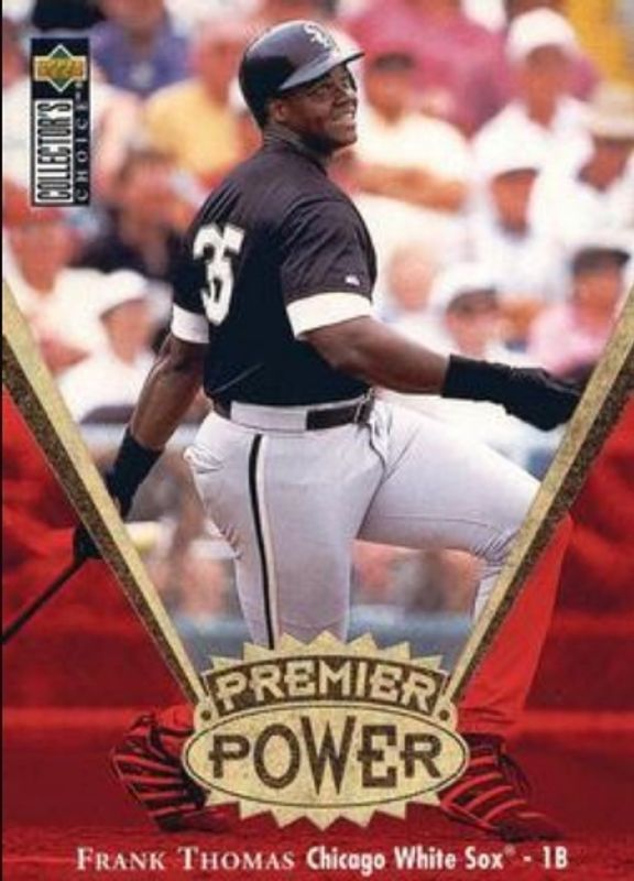 The Frank Thomas 1997 Upper Deck Collector's Choice #PP12 Premier Power Gold card is 1 of 24 Frank Thomas' card variations in the 1997 Upper Deck Collector's Choice set being tracked by Sports Card Investor, including #328 Base, #300 Base, #10 All Star Connection, #10 Big Shots, and #10 Big Shots 5x7.