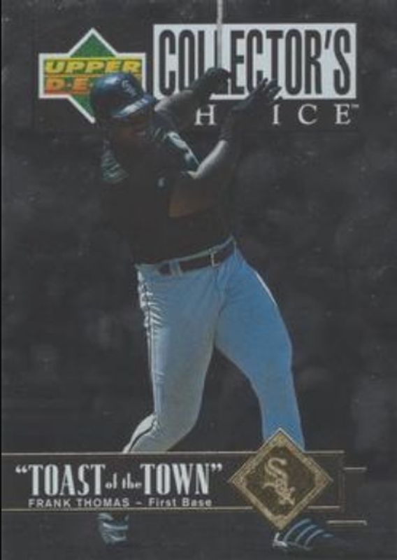 The Frank Thomas 1997 Upper Deck Collector's Choice #T11 Toast of the Town card is 1 of 24 Frank Thomas' card variations in the 1997 Upper Deck Collector's Choice set being tracked by Sports Card Investor, including #328 Base, #300 Base, #10 All Star Connection, #10 Big Shots, and #10 Big Shots 5x7.