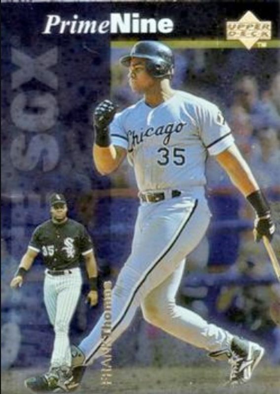 The Frank Thomas 1998 Upper Deck #PN16 Prime Nine card is 1 of 24 Frank Thomas' card variations in the 1998 Upper Deck set being tracked by Sports Card Investor, including #459 Base, #143 Base, #330 Base, #607 Base, and #18 10th Anniversary Preview.