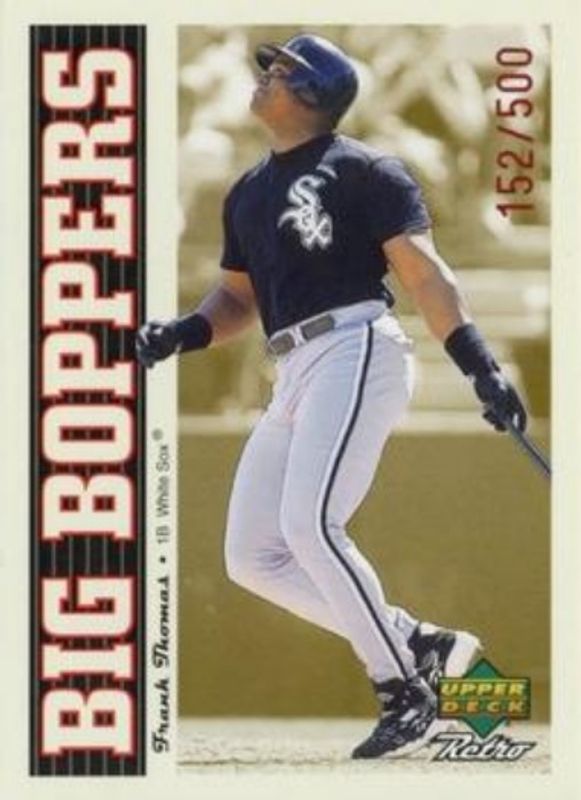 The Frank Thomas 1998 Upper Deck Retro #B6 Big Boppers /500 card is 1 of 7 Frank Thomas' card variations in the 1998 Upper Deck Retro set being tracked by Sports Card Investor, including #22 Base, #65 Base, #G4 Groovy Kind of Glove, #TC8 Time Capsule, and #FT Sign of the Times /100.