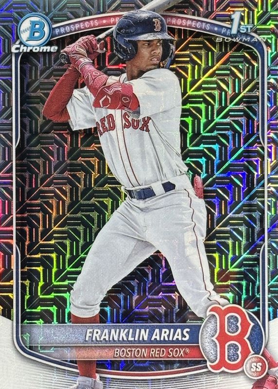 This card is 1 of 23 Franklin Arias' card variations in the 2025 Bowman Mega Box set being tracked by Sports Card Investor, including Chrome Prospects - Fuchsia Refractor /299 (1st), Chrome Prospects - Burgundy Refractor /275 (1st), Chrome Prospects - Purple Refractor /250 (1st), Chrome Prospects - Pink Refractor /199 (1st), and Chrome Prospects - Navy Refractor /175 (1st).
