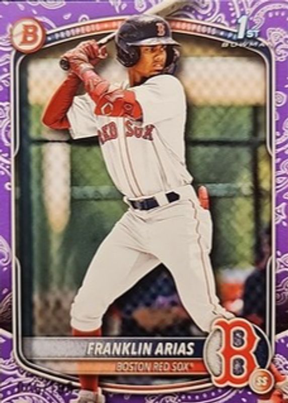 The Franklin Arias 2025 Bowman #BP-67 Prospects - Purple Pattern Border /199 (1st) card in Raw condition has not changed in price in the last 30 days and was last sold for $8.49 .
