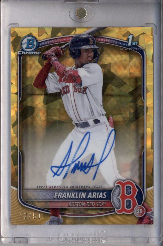 The Franklin Arias 2025 Bowman Sapphire Edition #CPS-FA Chrome Prospect Autographs - Gold Refractor /50 card is 1 of 16 Franklin Arias' card variations in the 2025 Bowman Sapphire Edition set being tracked by Sports Card Investor, including Chrome Prospects, Chrome Prospect Autographs /199, Chrome Prospect Autographs - Green Refractor /99, Chrome Prospects - Green Refractor /99, and Chrome Prospects - Yellow Refractor /75.