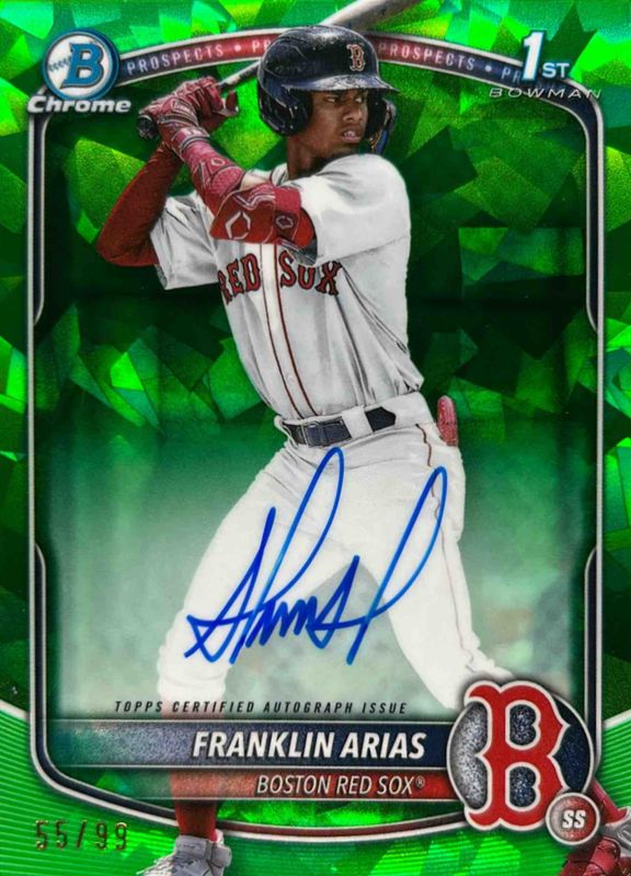 The Franklin Arias 2025 Bowman Sapphire Edition #CPS-FA Chrome Prospect Autographs - Green Refractor /99 card is 1 of 16 Franklin Arias' card variations in the 2025 Bowman Sapphire Edition set being tracked by Sports Card Investor, including Chrome Prospects, Chrome Prospect Autographs /199, Chrome Prospects - Green Refractor /99, Chrome Prospects - Yellow Refractor /75, and Chrome Prospect Autographs - Gold Refractor /50.