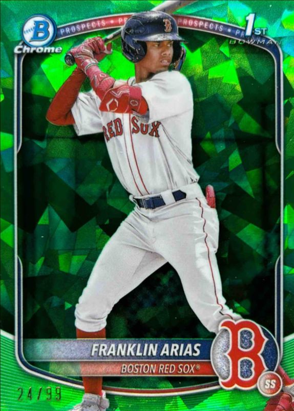 The Franklin Arias 2025 Bowman Sapphire Edition #BCP-67 Chrome Prospects - Green Refractor /99 card is 1 of 16 Franklin Arias' card variations in the 2025 Bowman Sapphire Edition set being tracked by Sports Card Investor, including Chrome Prospects, Chrome Prospect Autographs /199, Chrome Prospect Autographs - Green Refractor /99, Chrome Prospects - Yellow Refractor /75, and Chrome Prospect Autographs - Gold Refractor /50.
