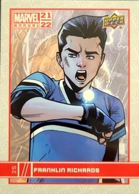The Franklin Richards 2021 Upper Deck Marvel Annual #25 Base card is 1 of 16 Franklin Richards' card variations in the 2021 Upper Deck Marvel Annual set being tracked by Sports Card Investor, including Blue, Canvas Variant, Green, Magenta, and Red.