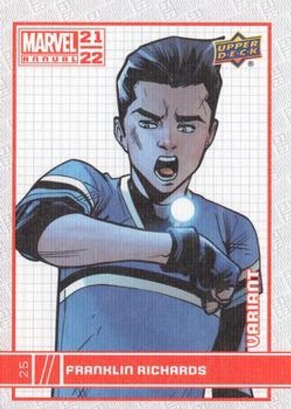 The Franklin Richards 2021 Upper Deck Marvel Annual #25 Canvas Variant card is 1 of 16 Franklin Richards' card variations in the 2021 Upper Deck Marvel Annual set being tracked by Sports Card Investor, including Base, Blue, Green, Magenta, and Red.